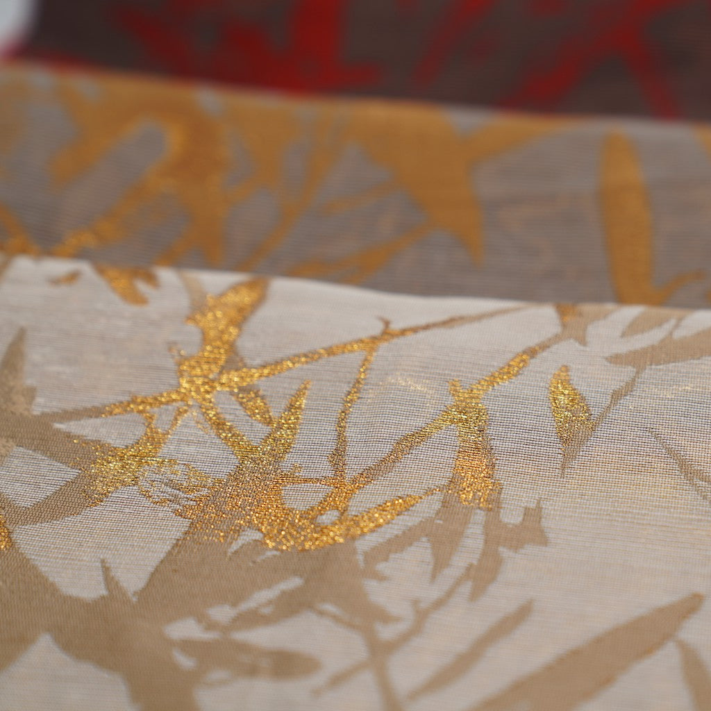 In the careful crafting of our textile, we have intricately interlaced shimmering golden threads amidst the bamboo leaves, enhancing the fabric's richness and dimensionality. This design mirrors the enchanting effect of sunlight filtering through a bamboo grove, creating a harmonious blend of color and texture that invites a sense of calm and connection to the natural world.