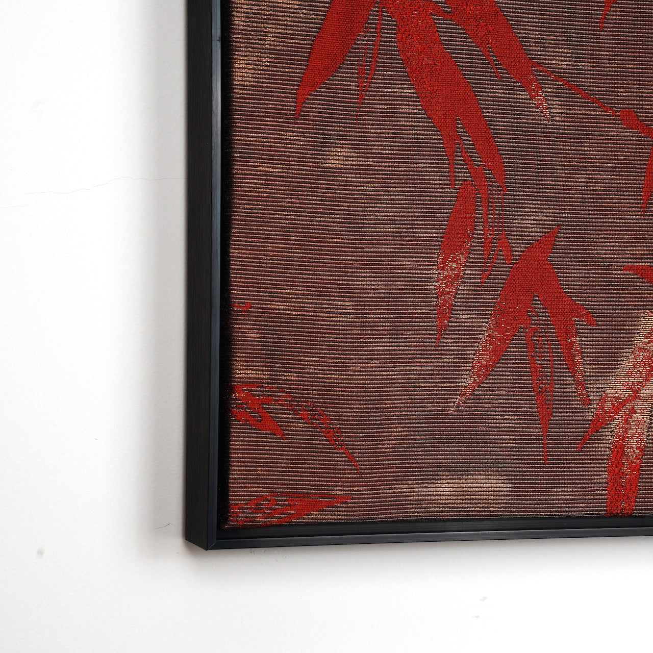 We frame the fabric in the same way as an oil painting, as glass weakens the details and texture of the fabric, we do not provide barrier glass.