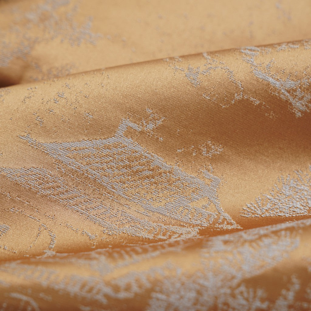 This is a fabric that embodies a modern Eastern aesthetic, featuring a depiction of a pine forest. We strived for a sleek visual appeal by employing two distinct color palettes: a dominant base color paired with a complementary scheme for the floral motifs. While achieving a pristine look, we also focused on perfecting the details of the design, ensuring that even the branches of the pine trees appear vividly lifelike upon closer inspection.