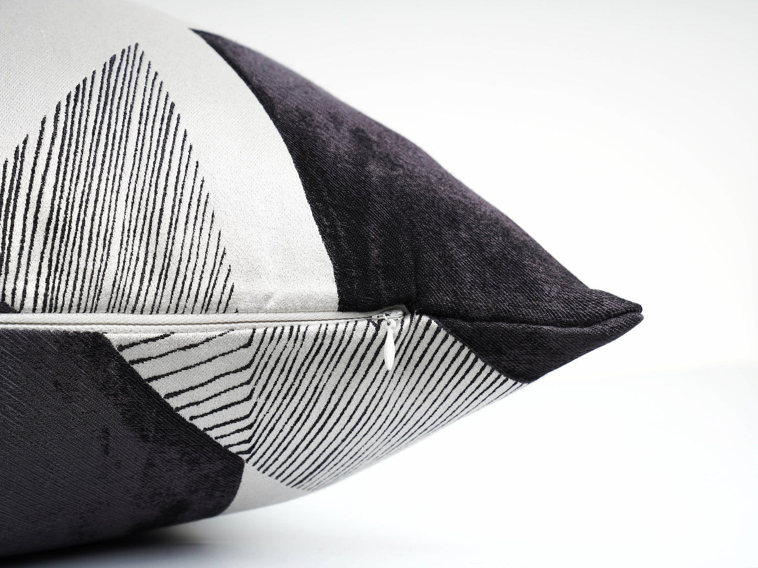 This decorative pillow features bold geometric patterns created through precise jacquard weaving techniques. The design utilizes striking color-block arrangements and clean linear elements to achieve visual impact through contrasting forms and hues.
