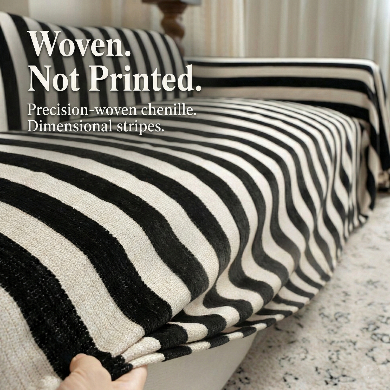 - Woven, not printed: dimensional stripes that look richer up close and stay crisp over time