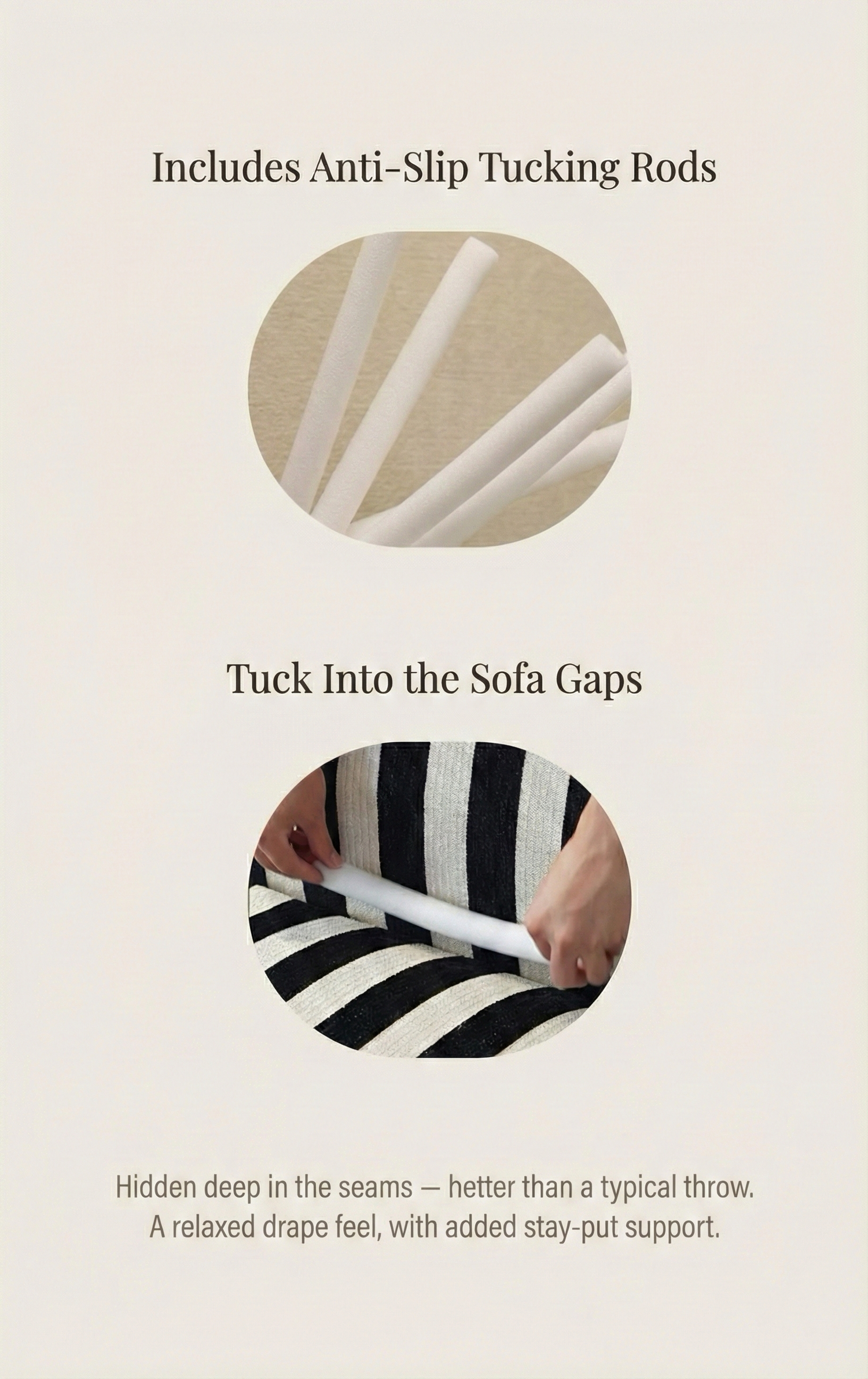 Foam tucking rods help anchor the fabric into the sofa gaps and reduce shifting. Not as tight as a fitted slipcover—much more stable than a normal drape.